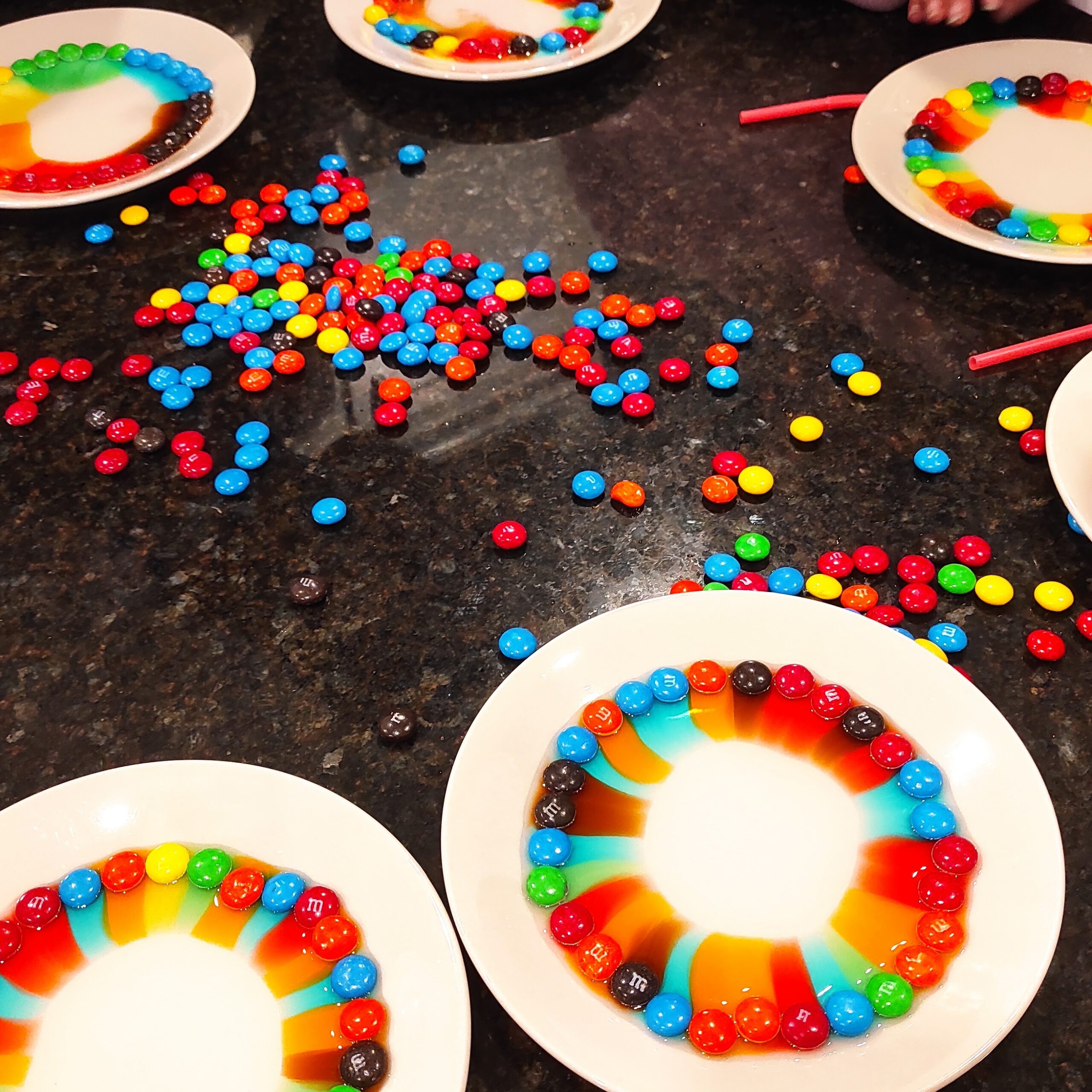 Jedes Kind bekam einen hellen Teller. In die Tischmitte ließ ich jede Menge bunte M&Ms rieseln, die nun als Kreis auf die Teller gelegt wurden. Anschließend goß ich vorsichtig Wasser in die Mitte der Teller, bis alle Schokolinsen das Wasser berührten.