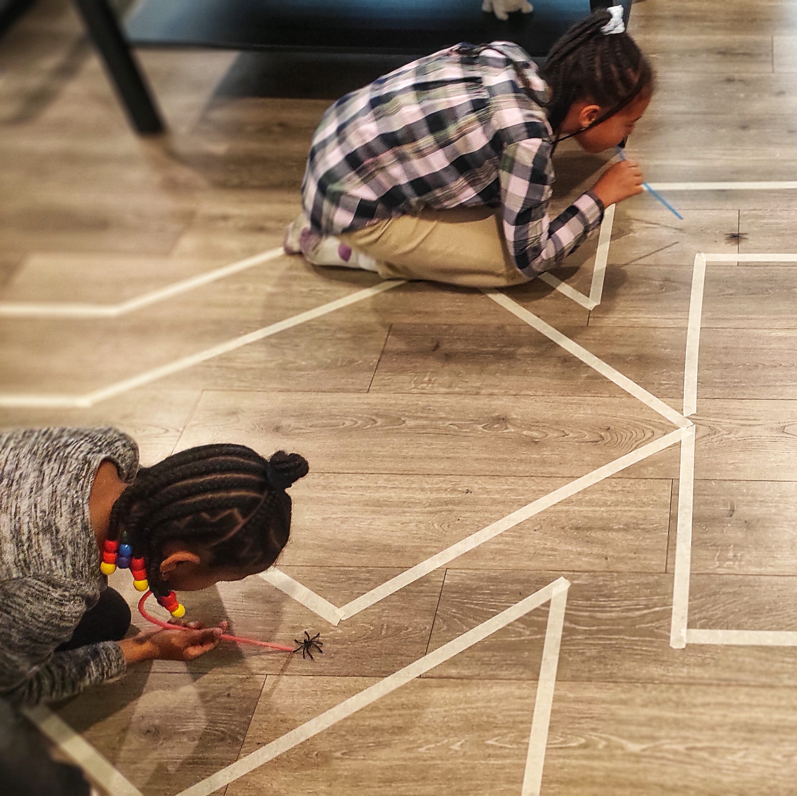 Die Lösung: Strohhalme. Mit ihnen konnten die leichten Plastikspinnen mühelos vorwärtsgepustet werden. Die Herausforderung bestand allerdings darin, den vorgegebenen Pfad nicht zu verlassen, den ich zuvor mit Kreppband auf den Boden geklebt hatte.