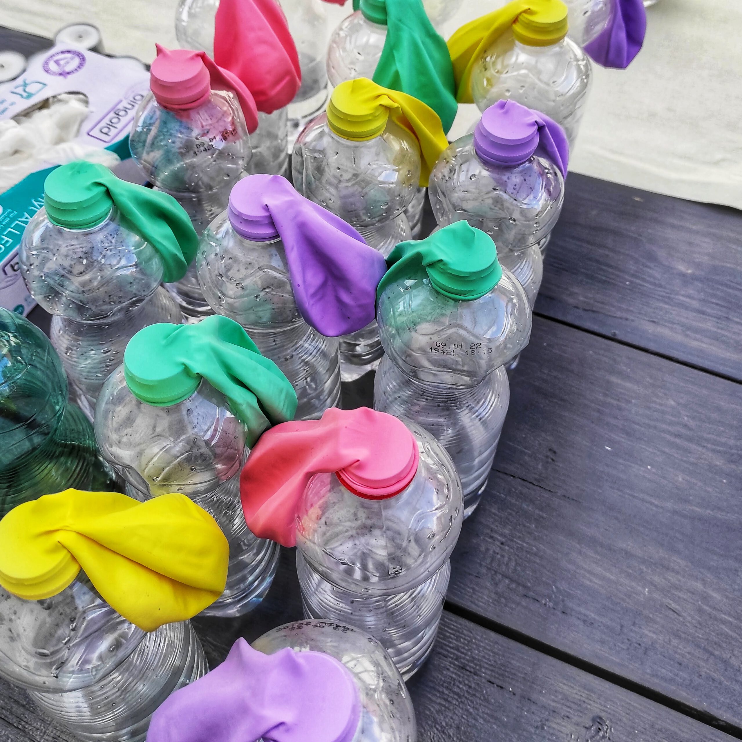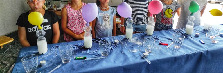 Jedes Kind bekam eine mit einer merkwürdigen Flüssigkeit gefüllte Flasche, über deren Öffnung ein schlaffer Luftballon gespannt war. Auf mein Zeichen hoben alle Kinder gleichzeitig die Ballons an – und diese bliesen sich ganz von alleine auf.