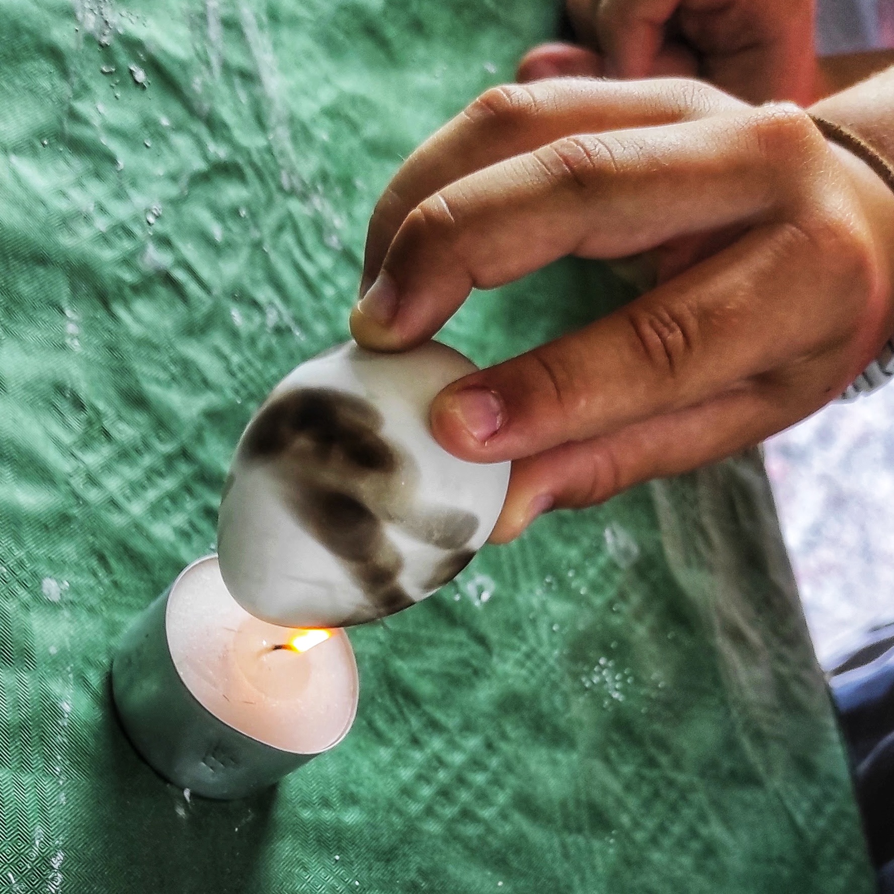 Ich nahm das hart gekochte und ausgekühlte Ei, rußte es über einer Flamme rundherum schwarz an und ließ es anschließend in ein Glas Wasser gleiten. Und siehe da: Die schwarzen Stellen begannen silbern zu schimmern.