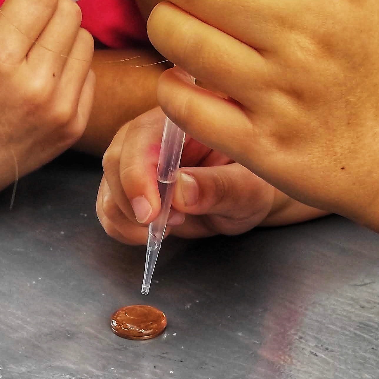 Gemeinsam wurde geraten, wie viele Tropfen wohl auf die Münze passen könnten – von zwei bis zehn war alles dabei. Doch als sich nach einigen Tropfen eine richtige Wasserkuppel bildete und am Ende tatsächlich 21 Tropfen Platz fanden, bevor das Wasser überlief, waren alle erneut sprachlos.