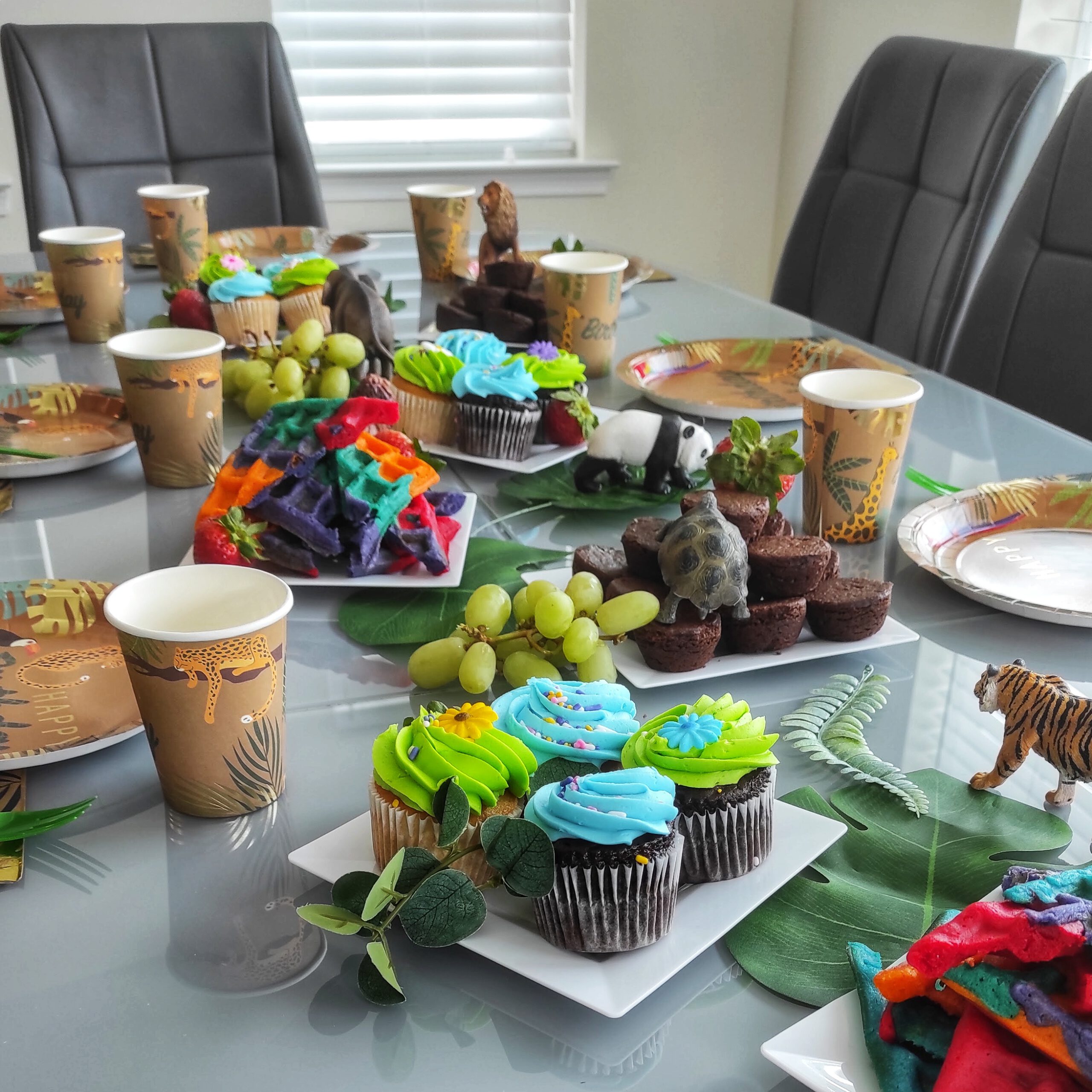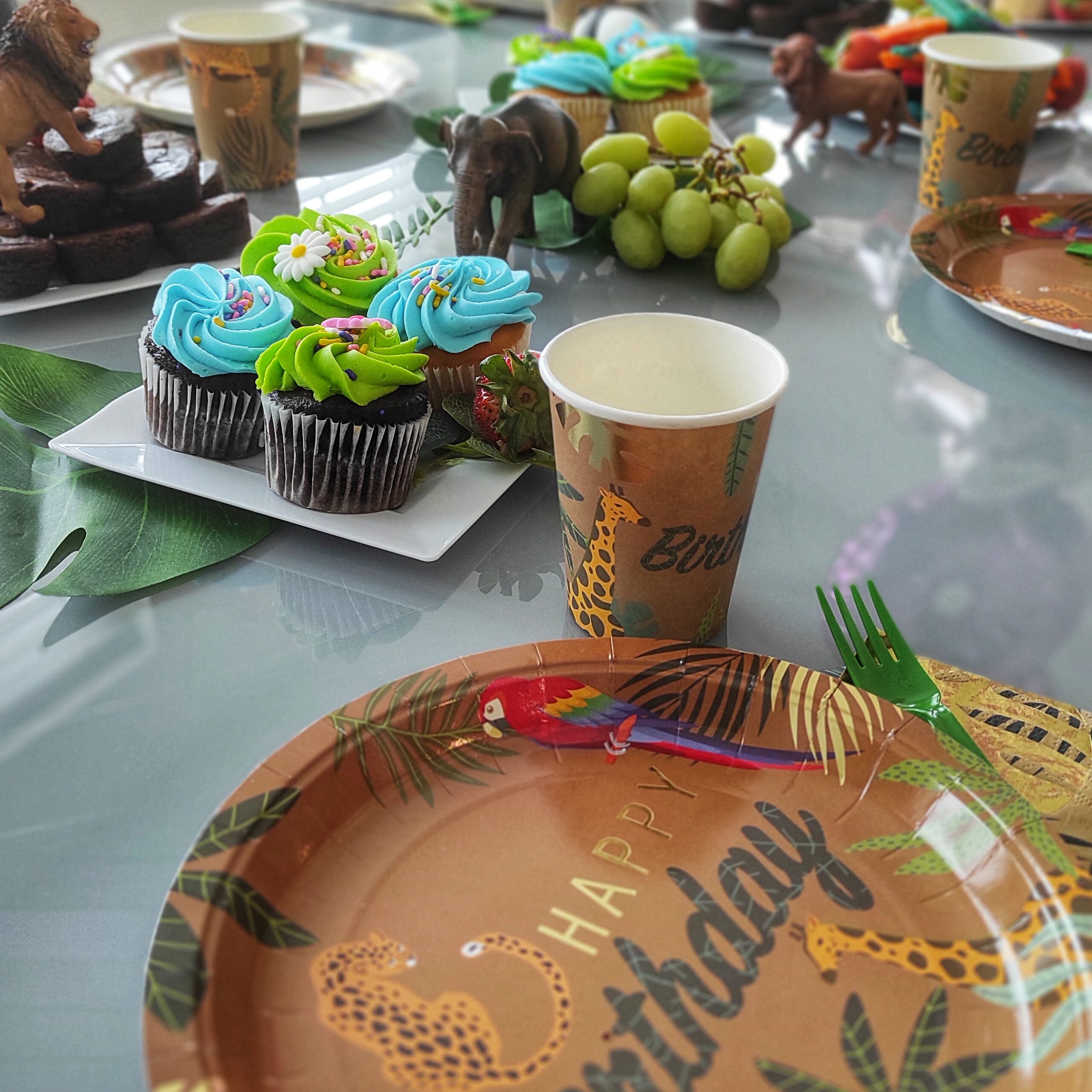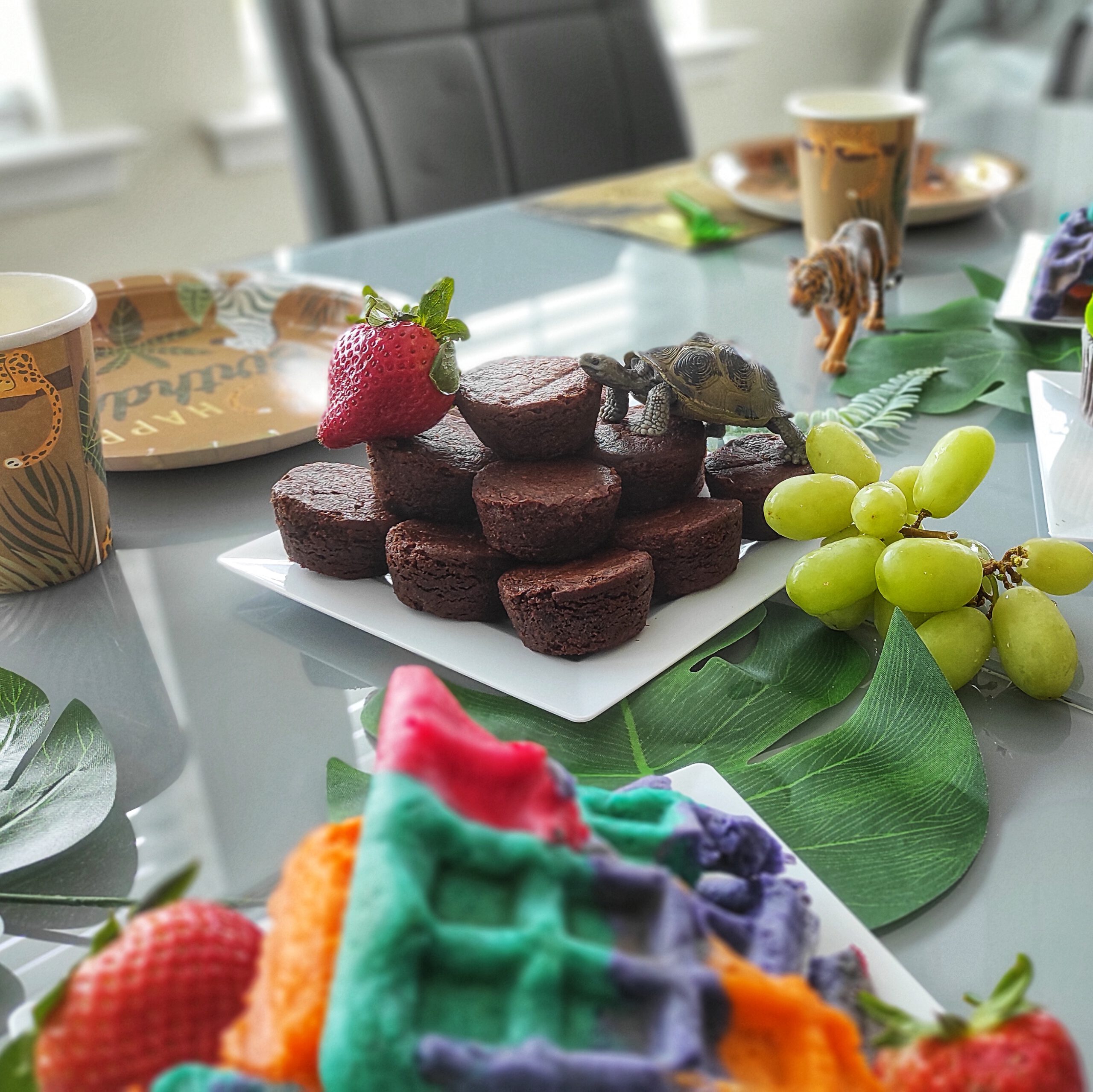 Dekoriert habe ich klassisch im Dschungel-Stil: Dschungel-Teller und Becher *, große künstliche Urwaldblätter *, Schleich-Tiere und jede Menge buntes Essen. Luftballons * durften natürlich nicht fehlen, und da bin völlig eskaliert. Sie sollten den Raum noch ein bisschen „dschungeliger“ wirken lassen, und am Ende wirkte es, also man untern einem Blätterdach lief.