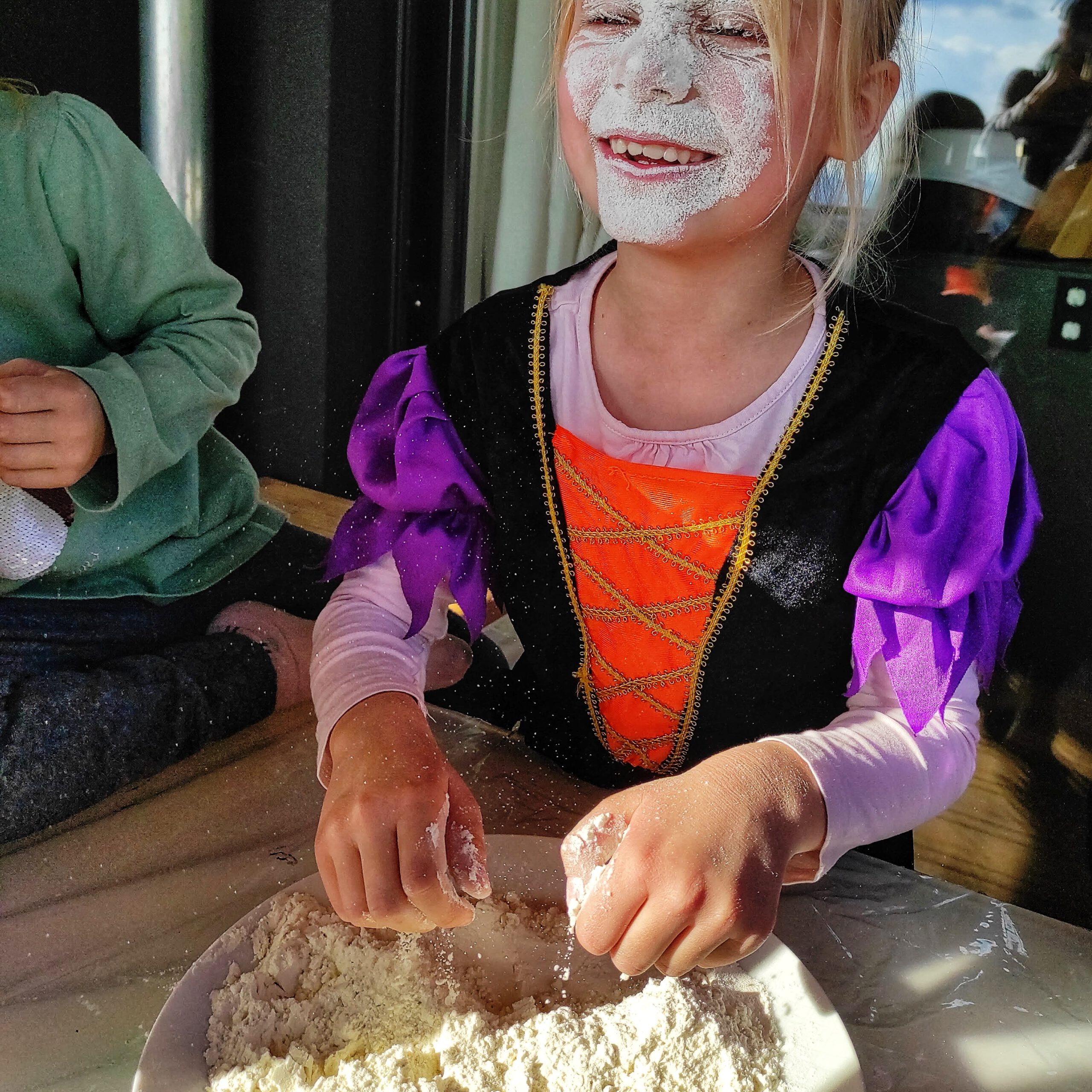 Petronellas Schwestern, die Wetterhexen, spielten mit den Kindern eine Runde Sonne (Feuer), Wasser, Blitz. Und Lucius benötigte dringend Hilfe beim Frühjahrsputz – also spielten wir Topfklopfen. Mit verbundenen Augen, auf Knien und mit einem kleinen Handbesen. Und ja: ausdrücklich auf Wunsch des Geburtstagskindes.