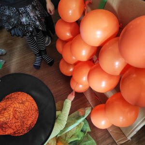 Auf ein großes Stück Karton hatte ich orangefarbene Luftballons * geklebt und so angeordnet, dass sie die Form eines riesigen Kürbisses ergaben. In einem der Ballons war ein Gummikäfer * versteckt. Der Reihe nach durfte jedes Kind mit einer Stricknadel einen Ballon zerstechen – bis (zum Glück erst gegen Ende) der Käfer herauspurzelte.