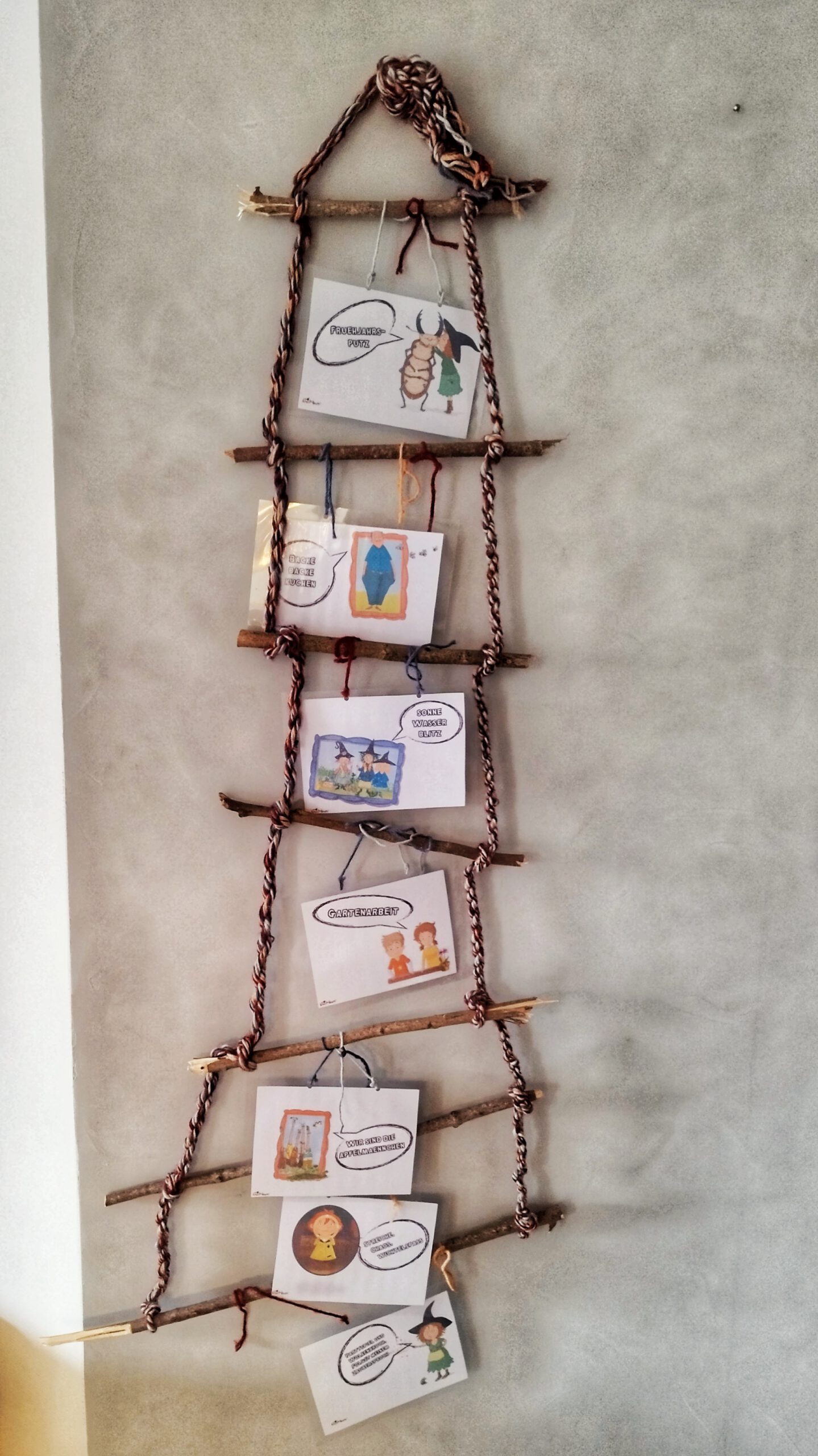 Diese hatte ich aus Ästen und Kordeln gebastelt und symbolisch im Raum platziert. Mit jeder Sprosse wartete ein neues Spiel auf die Kinder. War eine Aufgabe geschafft, wurde die entsprechende Karte entfernt – und der „Aufstieg“ zur nächsten Sprosse freigegeben. Die Aufgaben- und Charakterkarten von Petronella, Lucius, den Apfelmännchen & Co. findet ihr hier zum kostenlosen Download.