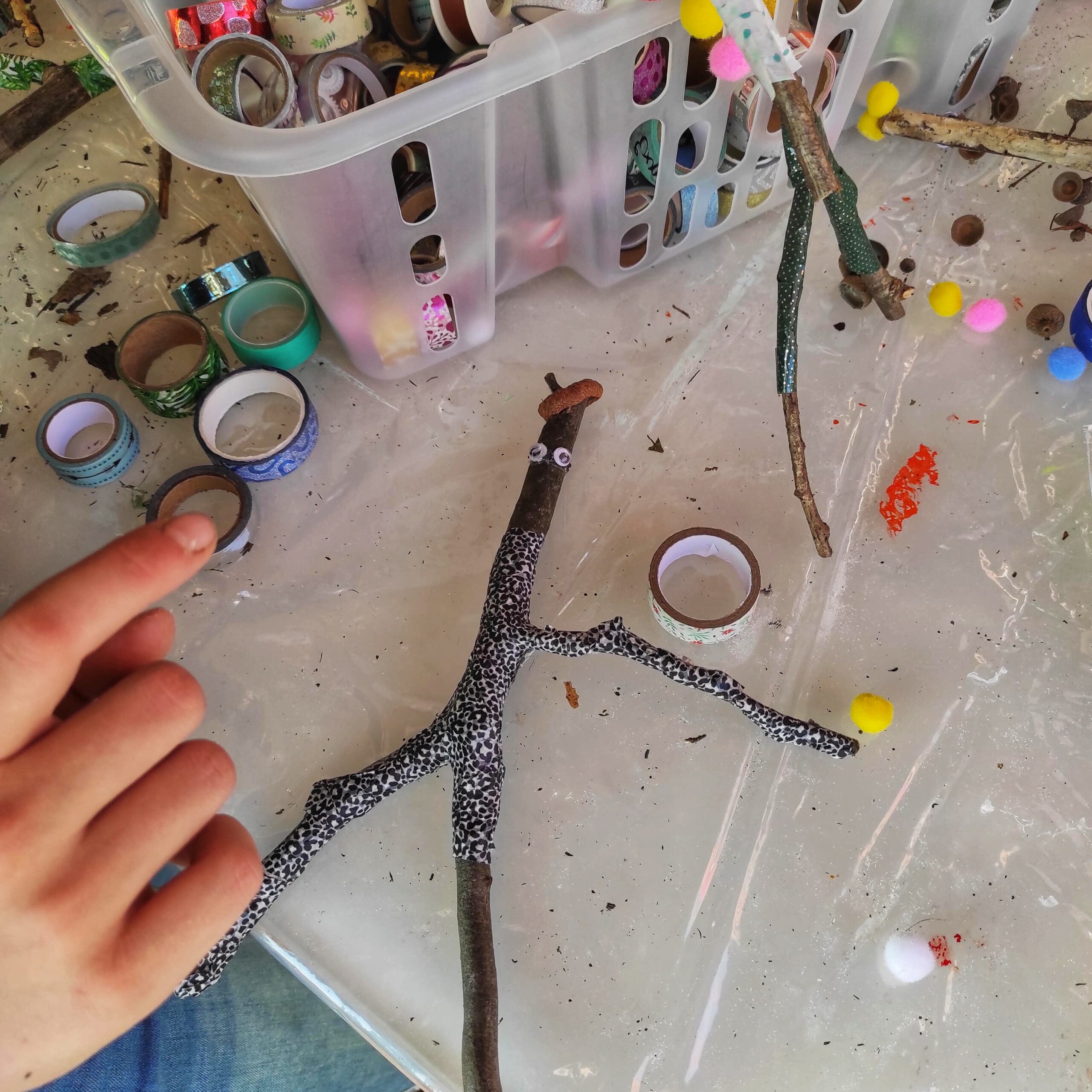 Wir versammelten uns um den Tisch, in dessen Mitte bereits eine Kiste mit Bastelmaterialien stand: bunte Washitapes *, Wackelaugen *, Basteldeko, reichlich Bastelkleber – und natürlich die noch ganz unscheinbaren Waldstöcke.