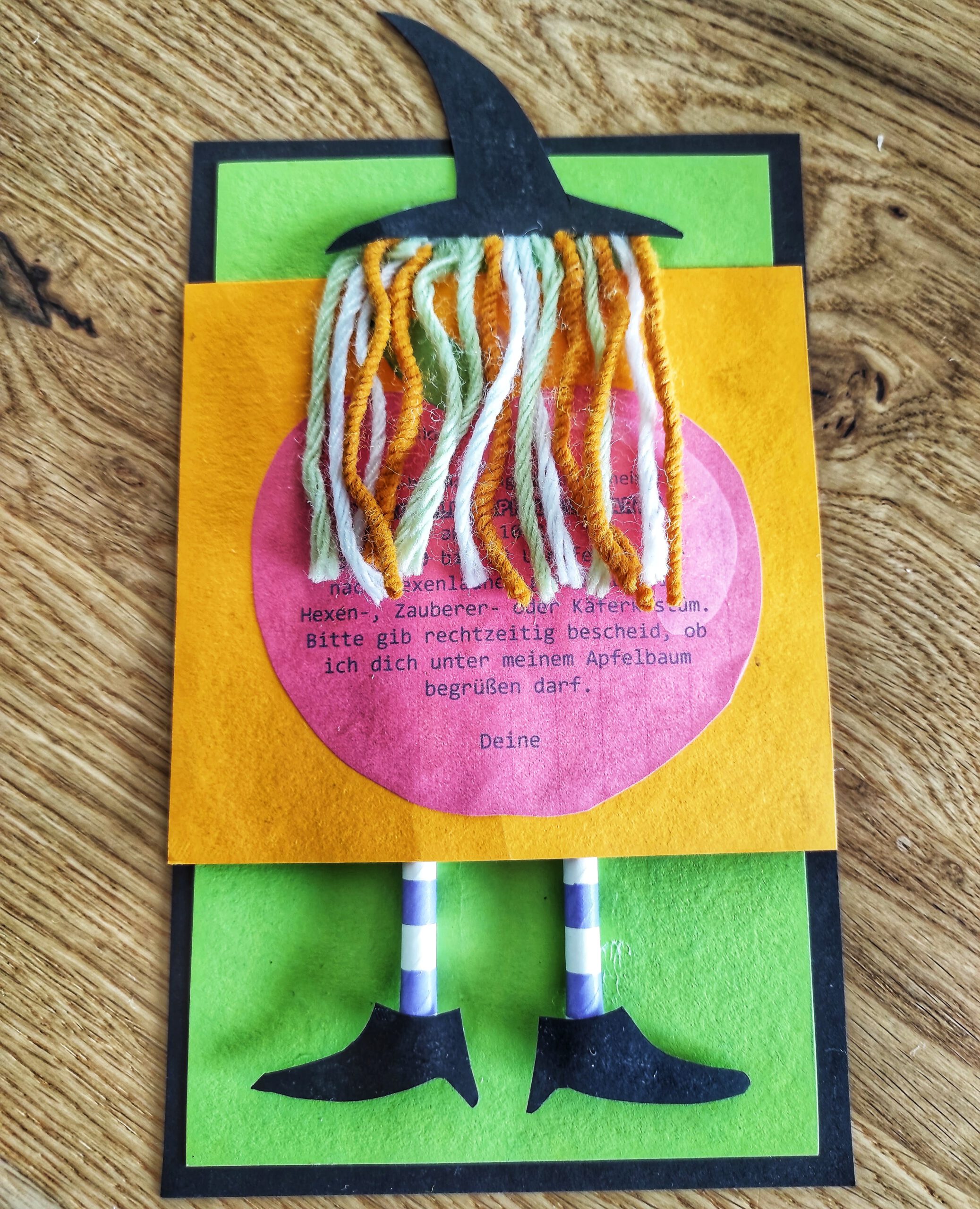 Die Einladung gestaltete ich bewusst schlicht und ein bisschen unperfekt: aus Tonkarton, Wolle für die Haare und Strohhalmen für die Beine. Viel mehr war von Petronella zunächst nicht zu sehen, denn sie versteckte sich hinter einem Apfel, auf dem der Einladungstext stand.